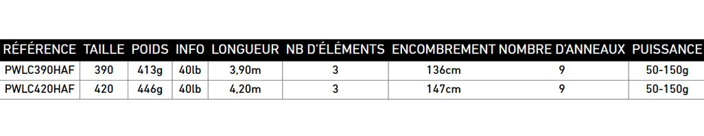 Longitud de 390 a 420 cm • Potencia de 50 a 150 gr • Enchufe: 3 filamentos • Blank carbono de alto módulo