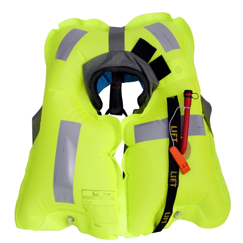 Cuando se infla el chaleco, su sistema flotabilidad se ajusta automáticamente, garantizando un ajuste perfecto para el rescatador. Ofrece un flotabilidad de 165 N y está equipado con un ligero Botella Co2 de 32 g. Su PU amarillo neón cámara está reforzado para soportar las condiciones más duras. Entre sus características se incluye una ventana de inspección para comprobar el funcionamiento del dispositivo en cualquier momento, y una hebilla de liberación rápida similar a la del cinturón de seguridad de un coche para una colocación rápida y segura.