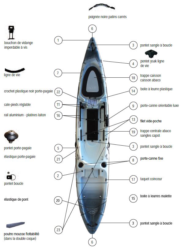 Este kayak está preequipado con reposapiés.La versión Estándar de este pack kayak de pesca Abaco 420 se entrega con el asiento Hi-confort de RTM y un fijo de aluminio remo.
