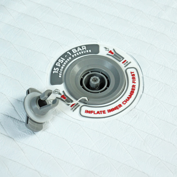 Un diagrama en la válvula muestra cómo utilizar el pulsador para inflar o desinflar la tabla. También indica la presión máxima de inflado recomendada.