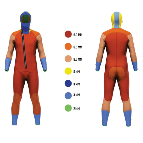 El traje de neopreno incorpora el system water stop, en el que un chaleco salvavidas escapulario interior especial material ultraresistente crea una doble barrera contra la infiltración de agua y proporciona un mejor aislamiento térmico.