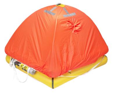 Diseñada para condiciones de navegación moderadas: construcción doble cámara, se infla a 0°C, fondo único, tienda naranja fluorescente con barra antivuelco fibra de vidrio desplegable manualmente para balsas de 4 y 6 personas.