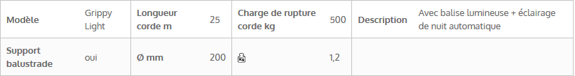 Por la noche, GRIPPY enciende automáticamente sus faros solares (versiones LIGHT, HEAVY y ABR). En el caso de un anclaje atascado, se puede liberar recuperando la cuerda, cuya resistencia a la tracción es superior a 500 kg (BÁSICO y LIGERO) o 1200 kg (PESADO y ABR).