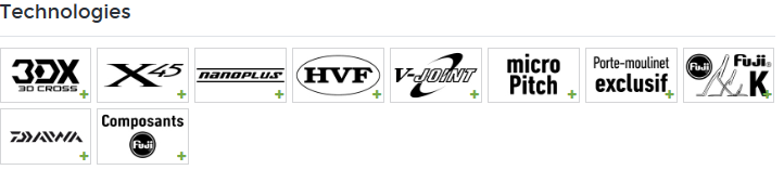 Proporcionan una sensación increíble al más mínimo toque y desgarros y sus acciones son de una precisión poco común. Las varillas incorporan la tecnología Daiwa V-Junta, que optimiza la curvatura de cañas de pescar y la resistencia de blank. Los anillos Fuji Fazlite favorecen la sensibilidad del caña de pesca y el exclusivo portacarretes Daiwa Air Sensor aligera el efecto general.