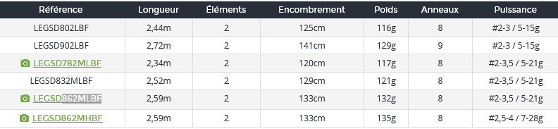 | 802LBF | Longitud en cm 244 volumen en cm 125 potencia en g 5-15 Peso en g 116 |