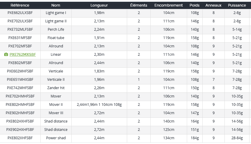 | Prorex E | 602ULFSAF Longitud en cm 183 , Volumen en cm 96 , Potencia en gr 2-8 , Peso en gr 83 , Partes 2 702ULFSAF Longitud en cm 213 , Volumen en cm 110 , Potencia en gr 2-8 , Peso en gr 101 , Partes 2 702LFSAF Longitud en cm 213 , Volumen en cm 110 , Potencia en gr 3-10 , Peso en gr 98 , Partes 2 802MLFSAF Longitud en cm 244 , Volumen en cm 126 , Potencia en gr 5-14 , Peso en gr 116 , Partes 2 602MFSAF Longitud en cm 183 , Volumen en cm 96 , Potencia en gr 5-21 , Peso en gr 102 , Partes 2 602MHFSAF Longitud en cm 183 , Volumen en cm 96 , Potencia en gr 7-28 , Peso en gr 107 , Partes 2 702HMHFSAF Longitud en cm 213 , Volumen en cm 110 , Potencia en gr 10-35 , Peso en gr 115 , Partes 2 802HMHFSAF Longitud en cm 244 , Volumen en cm 126 , Potencia en gr 10-35 , Peso en gr 125 , Partes 2 902HMHFSAF Longitud en cm 274 , Volumen en cm 142 , Potencia en gr 14-46 , Peso en gr 150 , Partes 2 802XHFSAF Longitud en cm 244 , Volumen en cm 126 , Potencia en gr 28-84 , Peso en gr 160 , Partes 2 902XHFSAF Longitud en cm 274 , Volumen en cm 142 , Potencia en gr 28-84 , Peso en gr 186 , Partes 2 802XXHFSAF Longitud en cm 244 , Volumen en cm 126 , Potencia en gr 60-120 , Peso en gr 166 , Partes 2 802XXXHFSAF Longitud en cm 244 , Volumen en cm 126 , Potencia en gr 80-180 , Peso en gr 184 , Partes 2 |