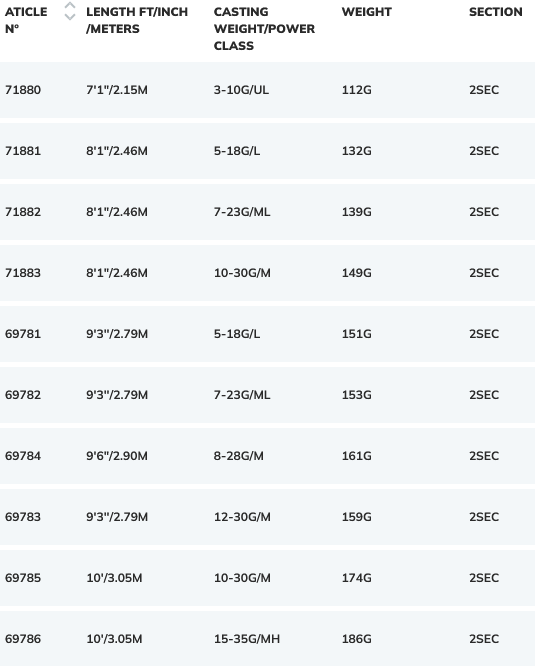 Longitud 215 a 305 cm • Potencia 3 a 35 gr • Enchufe 2 cabos o 4 cabos • Blans en carbono Toray 46T