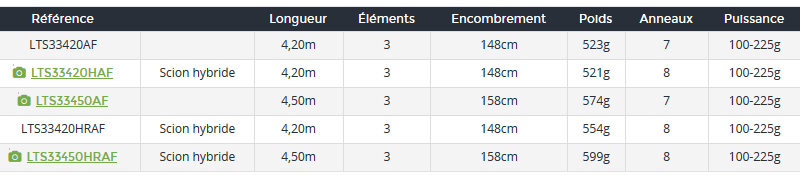 | 33450HRAF Puntera híbrida | Longitud 4,50m Elementos 3 Volumen 158cm Peso 599g Anillas 8 Potencia 100-225g |