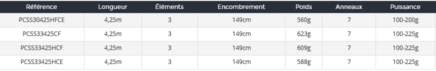 Longitud 425 cm • Potencia 100 à 225 gr • Enchufe 3 cabos • Blank carbono HVF Nano + y X-45