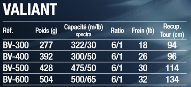 carretes El Valiant BV300 es ideal por su tamaño reducido, su ligereza y su capacidad para practicar jigging light, el slow jigging o la pesca de madai e inchiku. Es perfecto para pescar dentones, pagres o carangas de tamaño mediano. Esta nueva serie de carretes se basa en un nuevo concepto: Pequeños Carretes Grandes Peces .