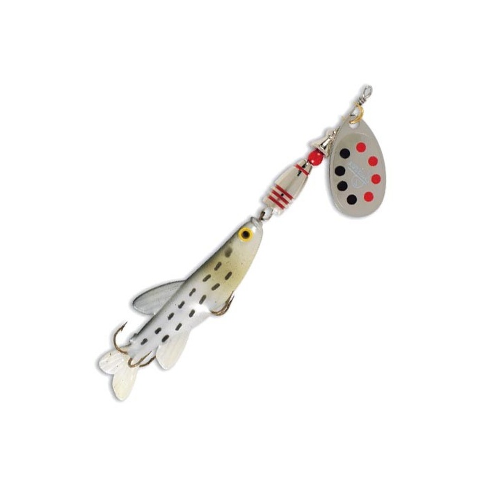Cuchara Ultra Minnow Silver PRN SUISSEX. Decoración plateada con puntos negros y rojos en la paleta y borde rojo en el lastre con un imitador de pececillo montado como un remolque.