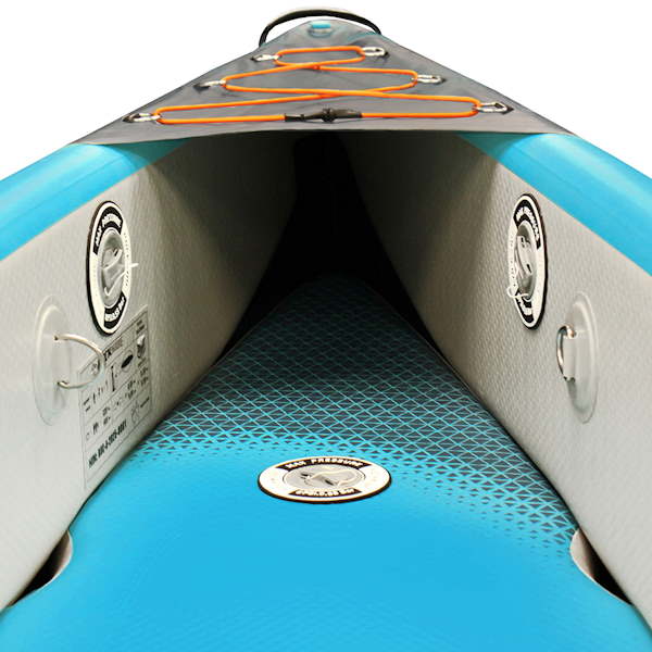 Situadas en la parte trasera del kayak, estas válvulas de alta presión permiten un inflado seguro y rápido a alta presión del kayak, utilizando una bomba suministrada de serie.