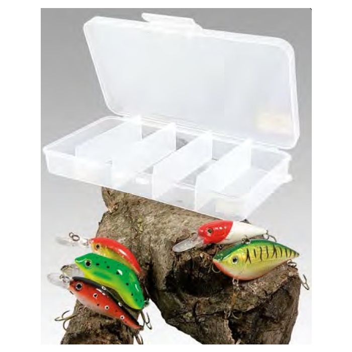 Caja polipropileno con 5 espacios de almacenamiento (17 x 9 x 3 cm) con una selección de 5 señuelos de varios colores