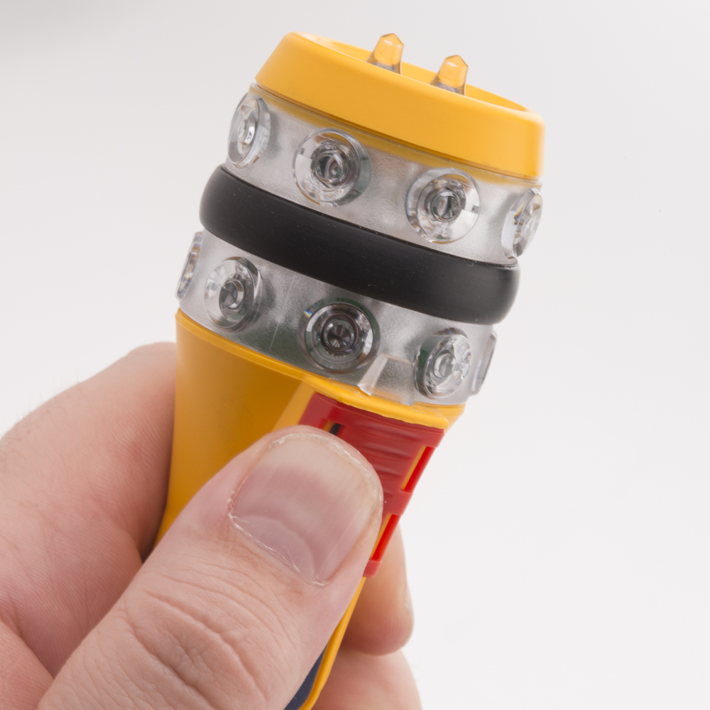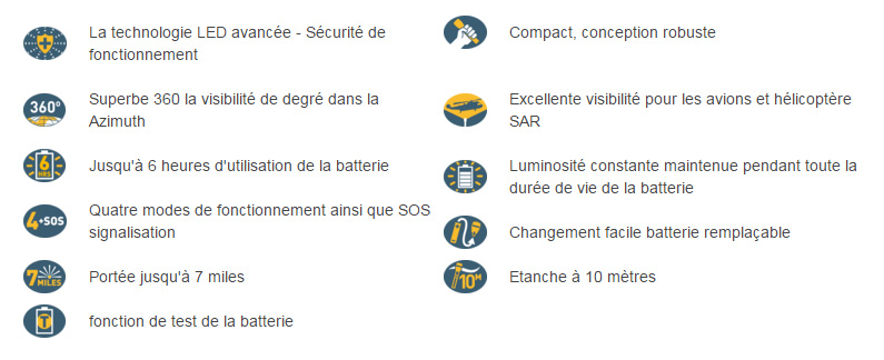 Esta linterna de mano crea un haz vertical de 30° sobre los 360° de su plano horizontal, lo que corresponde a una cobertura luminosa 6 veces superior a la de otras linternas de mano electrónicas. Además, la luz se difunde por toda la parte superior para garantizar una buena visibilidad desde el aire.