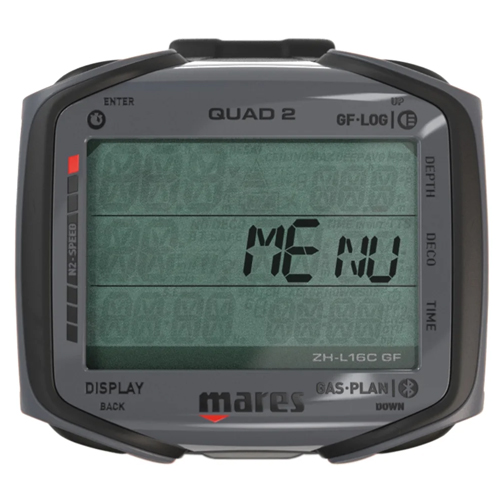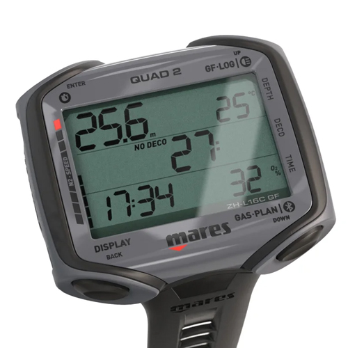 Los cuatro botones intuitivos del Quad facilitan la navegación durante la inmersión, ofreciendo un acceso rápido a datos esenciales como la profundidad, la temperatura y la información sobre los gases utilizados.
