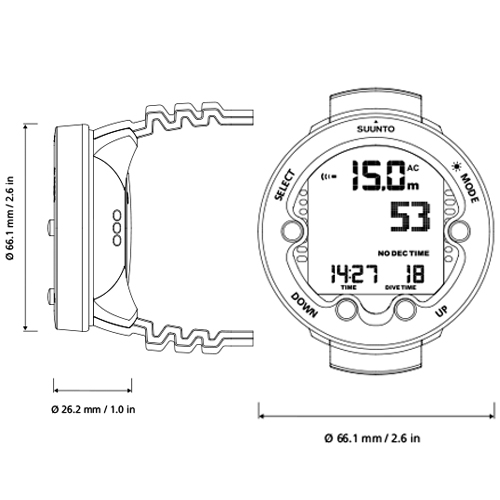 - Registros gráficos detallados y datos de inmersión accesibles en Mac mediante el software Suunto DM5 (cable no incluido en el set de accesorio vendido por separado)