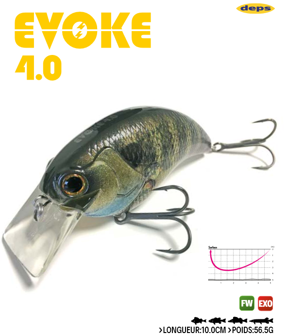 Magnum silent crankbait diseñado para grandes lubinas en Japón y los EE.UU., el EVOKE 4.0 se utiliza en entornos con alta presión de pesca.Lo hemos seleccionado para la búsqueda de grandes picas en los obstáculos (hierba, madera, roca). El EVOKE 4.0 es un crankbait sobredimensionado, un gran bocado comparado con los crankbaits del mercado
