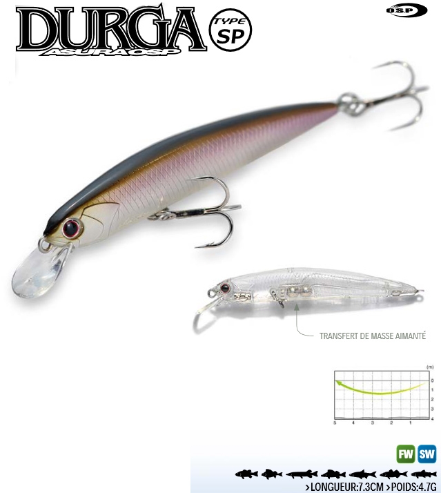 La DURGA completa la famosa serie de minnows OSP con una nueva obra maestra, hecha con los mejores componentes japoneses.La DURGA se lanza más fácilmente y más lejos que los pececillos del mismo tamaño. gracias a una nueva transferencia de masa magnetizada que la hace perfectamente silenciosa.