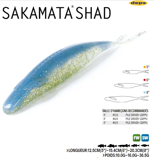 El DEPS SAKAMATA SHAD es un señuelo con una forma atípica fruto de una amplia investigación. Se diferencia de los sábalos finos tradicionales en que tiene dos apéndices en los laterales. Cuando no tiene peso y se sacude, el alas confiere al señuelo una amplia gama de movimientos.