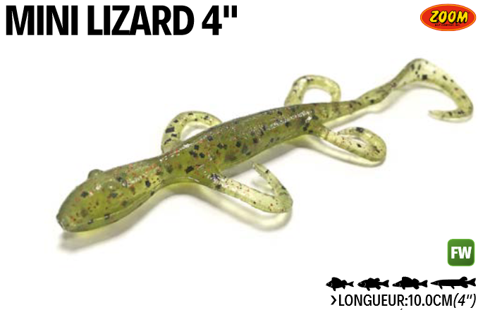 El MINI LIZARD es la versión delgada del famoso Lagarto ZOOM, famoso durante muchos años. Ha sido uno de los mayores Bass jamás capturado en California y México.Sus patas y su cola en forma de coma emiten vibraciones en cada animación.