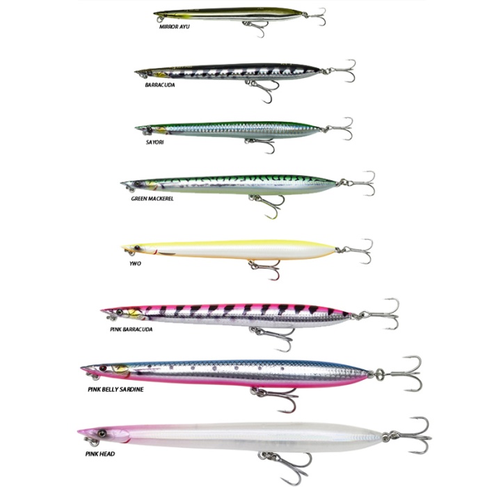 - Tamaño de Anzuelos : 125mm #8 ST46 UAR 155mm #4ST46 UAR 180mm #2 ST46 UAR 210mm #1/0 ST46 UAR Técnica de pesca : sacudidas lentas durante la recuperación y el señuelo realizará una amplia y lenta acción de lado a lado. Una sacudida rápida, y realizará una acción rápida y limpia de lado a lado. Con la punta de la Caña alta y una rápida recuperación, la señuelo realizará una acción de rebote en la superficie imitando a un pez que se escapa.
