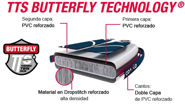 La cubierta es una capa de tela en PVC reforzada y recubierta. La rigidez de la tabla es mejorada gracias al pegado de una banda en PVC adicional en toda la circunferencia.