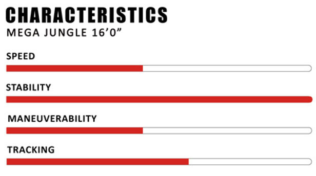 “ Diseñado con una generosa longitud de 487 cm y una anchura de 142 cm, el Mega Jungle ofrece una plataforma muy grande para garantizar que todos los riders tengan espacio suficiente para moverse y remar sin estorbarse unos a otros.