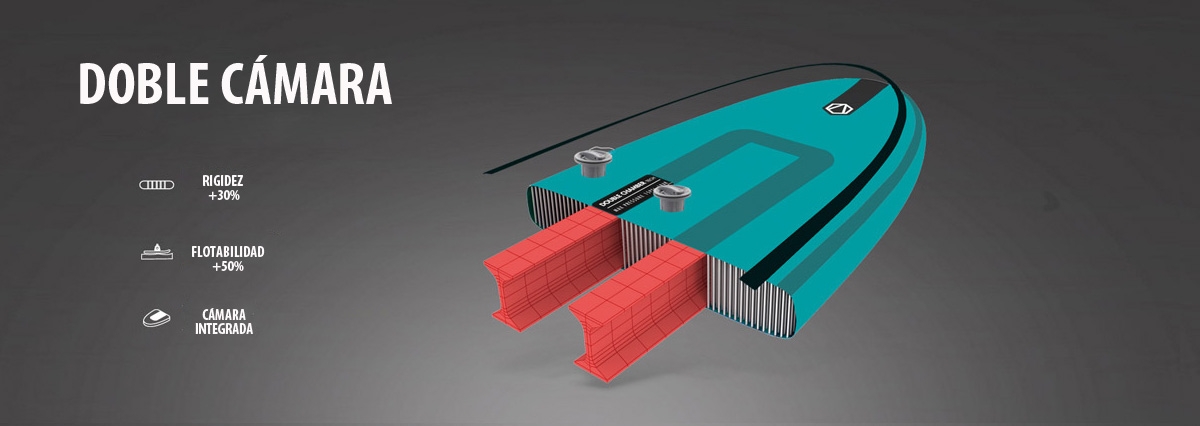 La segunda cámara revolucionaria actúa como una estructura de pilares en la doble pared lateral lo que aumentará la rigidez total. Esta cámara cubre prácticamente la mitad del Área total y se sitúa entre la red elástica de la cubierta y el final de la almohadilla, está estratégicamente situada en la "zona donde estás de pie", limitando considerablemente las desventajas de la partes "blandas" e "inestables" de un paddle surf hinchable ya que asegura una mejor estabilidad incluso en el agua agitada cuando el viento es fuerte.