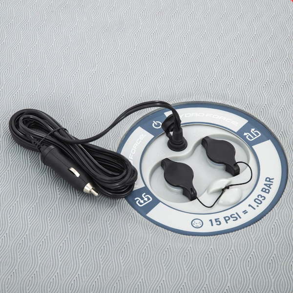 Además, está equipado con un inflador eléctrico e integrado en el SUP e funciona con una toma de 12 V para el encendedor del coche.