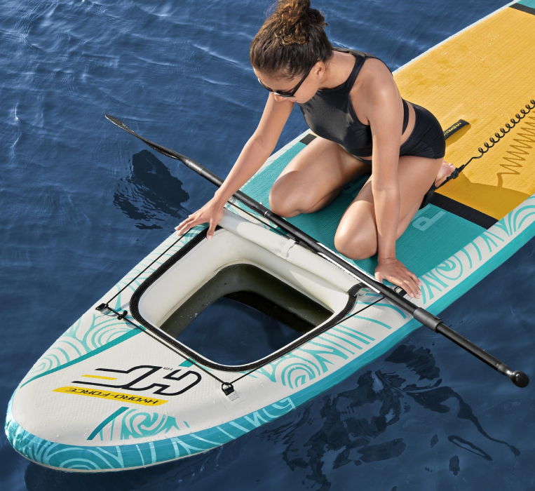 “ Descubre el mundo submarino con el nuevo remo hinchable Hydro Force Panorama de Bestway. El Panorama tiene una ventana transparente en la parte delantera que te permite ver el mundo marino mientras practicas SUP. Esta ventana panorámica te permite observar los peces y también se puede utilizar como una caja de almacenamiento para guardar una pequeña bolsa impermeable, una botella o cualquier otro equipo que necesites para aprovechar al máximo tu día. La ventana se puede cerrar con una tapa que se puede fijar al marco de velcro de la ventana.