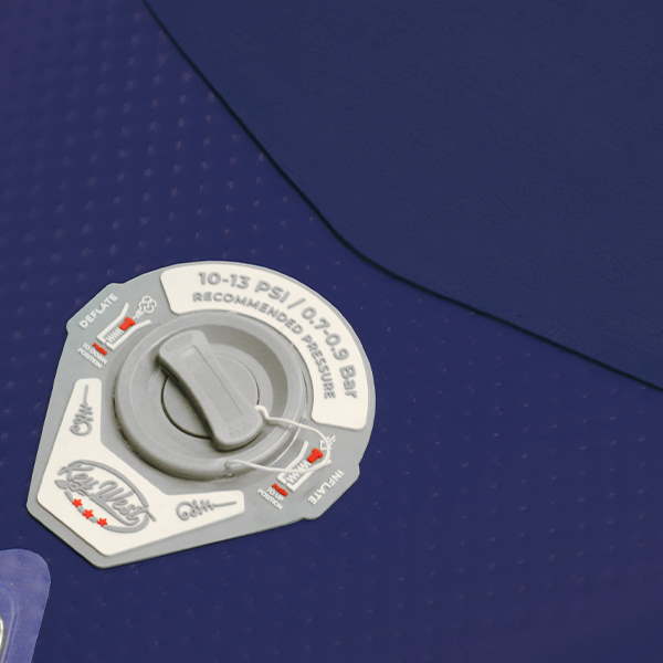 Un esquema situado en el contorno de la válvula muestra cómo utilizar el botón pulsador para inflar o desinflar la colchoneta hinchable « tabla ». También indica la presión máxima de inflado recomendada.