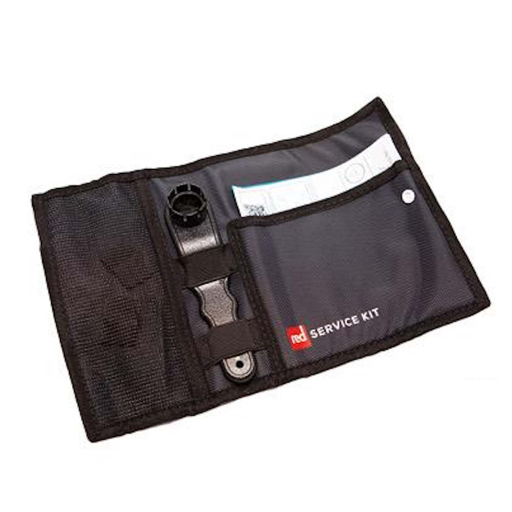 El kit de reparación incluye un parche de material MSL del color adecuado para la parte delantera y trasera de la tabla (150 mm x 150 mm). La llave de válvula también se puede usar para raspar el pegamento al reparar pinchazos. Todo se guarda junto con las instrucciones en la pequeña caja naranja resistente al agua.