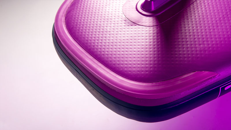 La 2ª capa de PVC se fusiona en caliente con la primera y se estira. La fibra unidireccional, visible en la construcción, se inserta entre las dos capas. Esta tecnología reduce el peso de paddle surf en 2 kg en comparación con todos sus competidores.