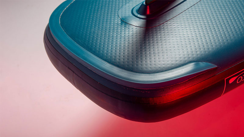 La 2ª capa de PVC se fusiona con calor a la primera capa y se estira. La fibra unidireccional, visible en la construcción, se inserta entre las dos capas. Esta tecnología reduce el peso de paddle surf en 2 kg en comparación con todos sus competidores.