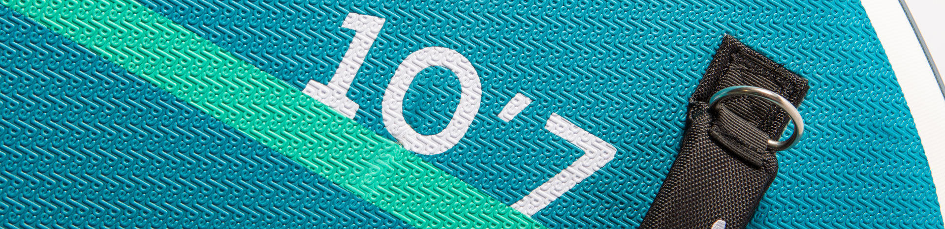 Tabla SUP hinchable - Longitud 10'7" / 326 cm - Anchura 33" / 84 cm - Grosor 4.7" / 12 cm - Volumen 257 L - Peso 23.32 ib / 10.6 kg - Peso rider max 120