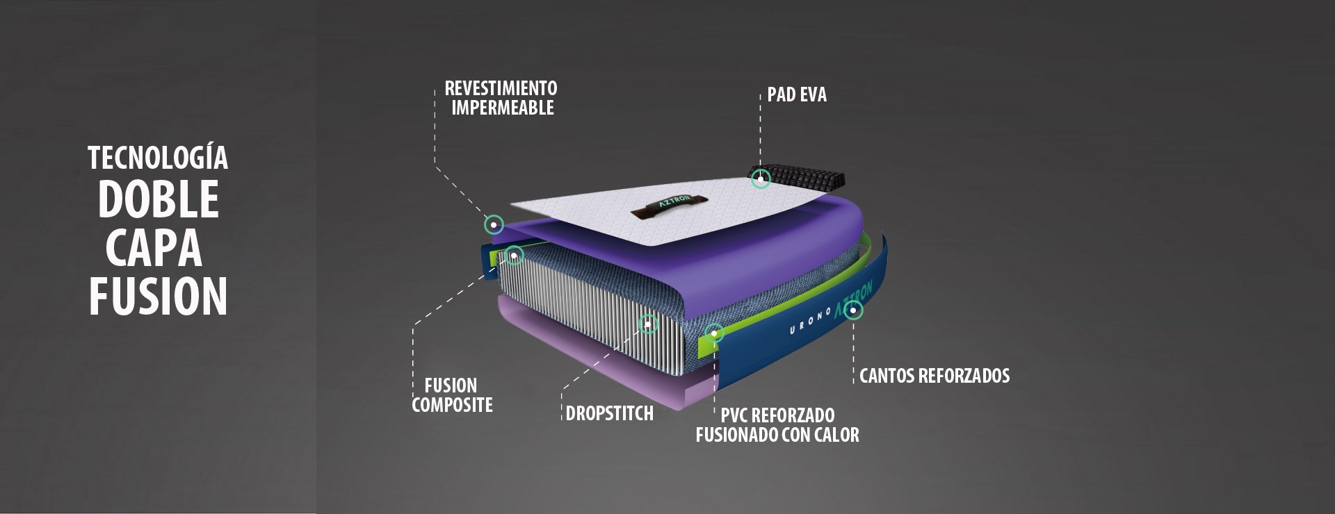 "Extra rígido y ultra ligero". La tecnología de doble capa fusionada es reconocida como el proceso de construcción de primera clase. Esta tecnología de materiales de alta gama se aplica a todas las tablas sup hinchables Aztron (excepto la Lunar y la Mercury). Ellas están dotadas de una segunda capa de PVC fusionada con la capa inferior. Se laminan directamente en caliente sobre la capa base y alrededor del dropstitch. Utilizando esta técnica de manera mecánica se evita eficazmente todo tipo de error humano en el proceso tradicional de doble capa. Como todo este proceso se realiza antes del ensamblaje, se crea una rigidez y adherencia increíbles, dando como resultado una combinación de rendimiento, calidad y ligereza.