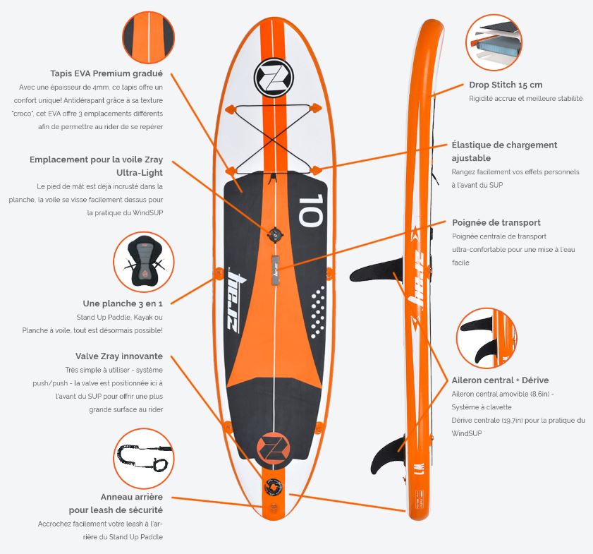 Fabricados con Dropstitch de una sola capa con Stringer o doble piel, toda la gama tiene un doble capa en canto para garantizar la durabilidad del producto. El concepto Zray también está orientado a la fabricación de paddle surf hinchable con un grosor de 15 cm grosor para garantizar la máxima rigidez.