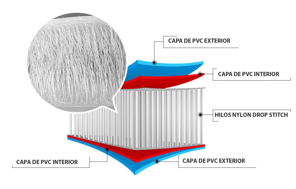 Paddle surf hinchable en dropstitchUn SUP hinchable está fabricado con la tecnología Drop-Stitch. El Drop-Stitch es una estructura compuesta de 2 capas (o más) de PVC que están enlazadas entre ellas mediante hilos. Los hilos están hechos de nylon y dependiendo de la marca pueden ser más o menos numerosos y densos.